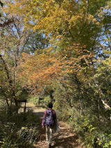 | ヤマハッカが群生を作り、鮮やかなブルーが際立つ。ヤクシソウやシラヤマギクは盛りを過ぎていた。キバナアキギリもあちこちで見られたが、もう終わりかけだった。樹々もだいぶ色づいてきた。 |