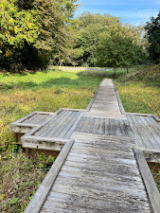 | エヶ入(えがいり)谷戸へと下る。湿地帯の木道両側には、ミゾソバ、ウシハコベ、フトイが多い。 |