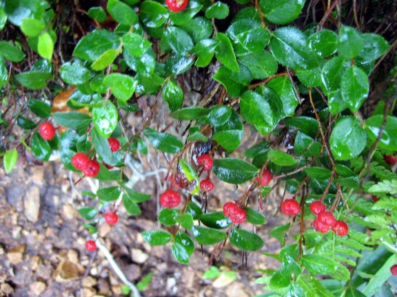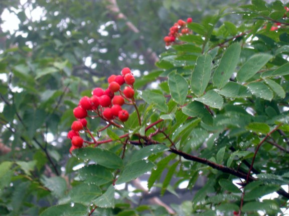 出発する頃には雨はやみ、ガスで真っ白な中を冷乗越へと登る。ナナカマドはもう赤く色づいていた。 |