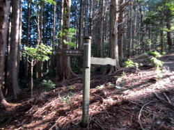 | よく見ると、反対側に仏坂の小さな標識があった。本当はここに続くらしいが、この先通行できないところがあるそうなので、林道を下ることにした。 |