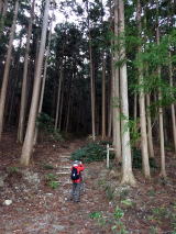 岸に着くと、仏坂の急坂が待ち構えていた。杉林の中はよく整備され、割合明るい。道は九十九折になり、上が見えない。 |