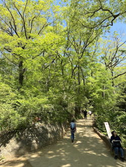 | 若葉が目にもやさしい気持ちのよい季節。連休の合間の平日だが、早かったのでまだそれほど混雑はしていなかったが、下るときには大勢の人がどんどん上って来た。連休の混雑が思いやられる。 | |