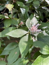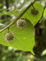 | オオバヤシャブシの木に種子を飛ばした果穂と雄花がついていた。ヤシャブシとハンノキの違いがよくわからない。これはひょっとしたらハンノキかもしれない。 |