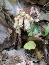 | 花が少なく観察会は早く終わったが、ヒメザゼンソウを探してみた。途中で出会った詳しそうな方に聞くと、簡単に教えてもらえた。葉は沢山出ていた。初夏の花が咲く時が楽しみだ。 |